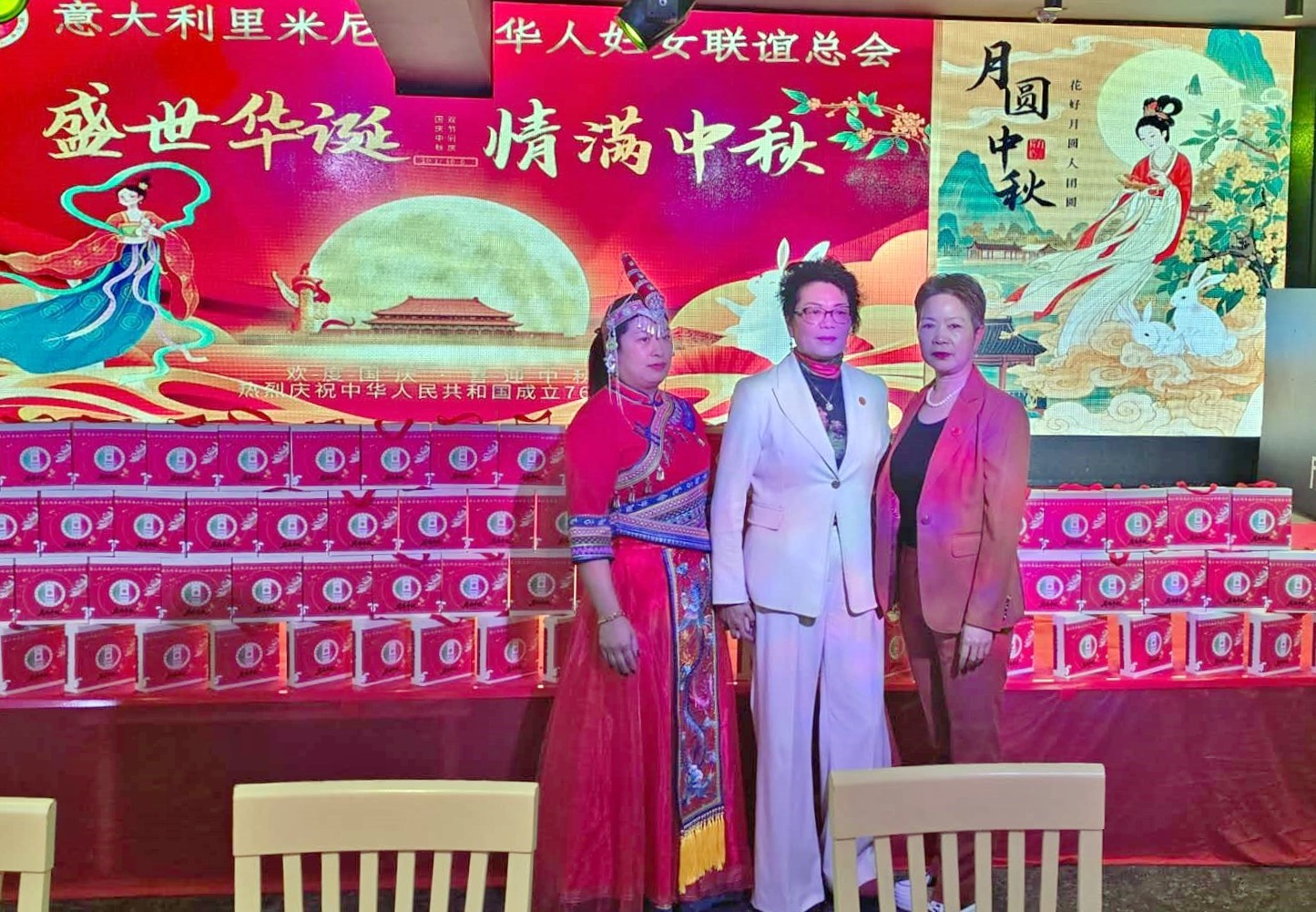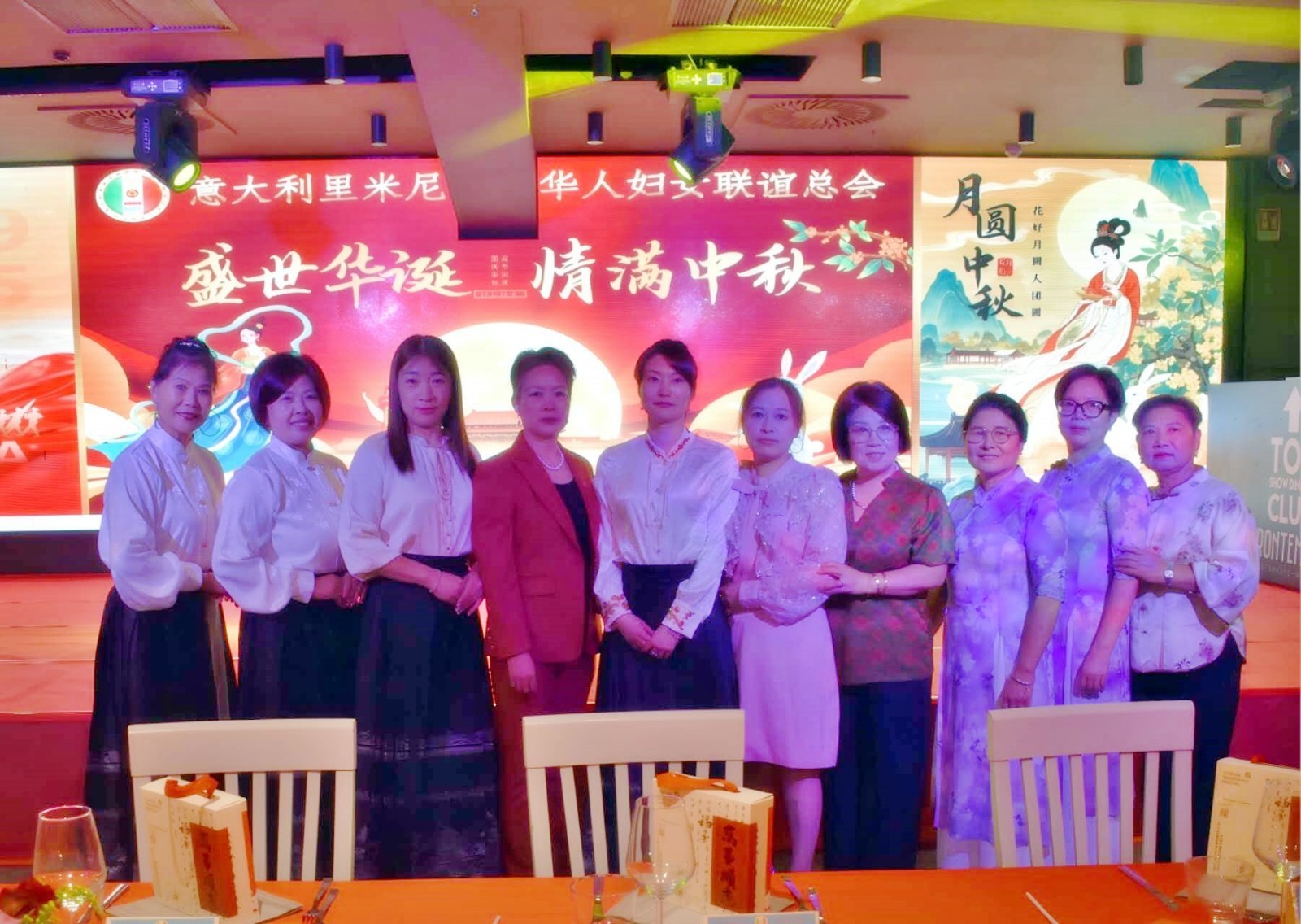 整场晚会不仅是一场视听盛宴,更是一场心灵的交流。海内外中华儿女同赏一轮明月,共叙家国情怀,现场洋溢着喜庆、祥和与团圆的氛围。同时,在温馨喜庆的氛围中,里米尼华侨华人妇女联谊总会的成员们也积极为晚会贡献心力。章爱柳、陈相琴、吴如意、卢珠莲、胡小娟、胡玲妹、郑上红等几位成员,特意为晚会赞助了象征团圆的中秋月饼,为现场嘉宾和侨胞们送上节日的甜蜜与祝福。精美的月饼不仅承载着中华传统文化的浓浓韵味,也让海外游子在异国他乡感受到家的温暖。