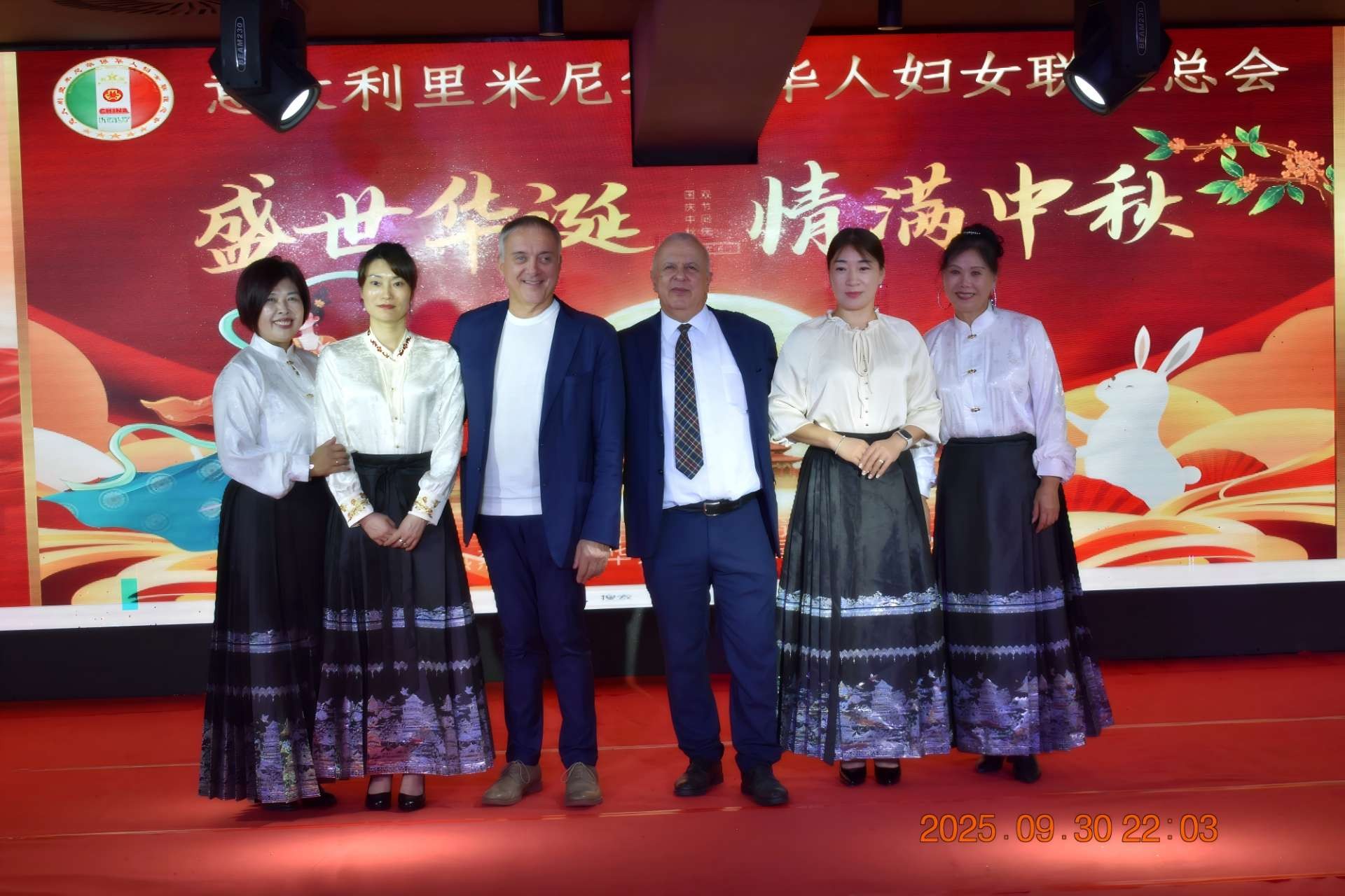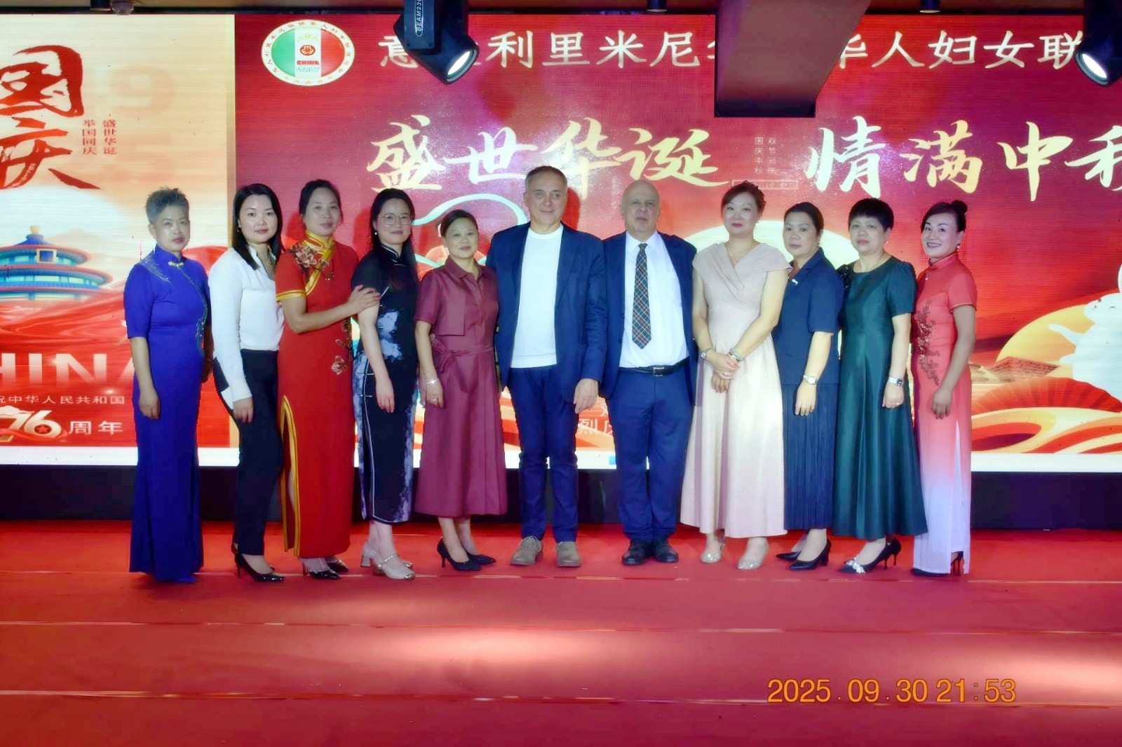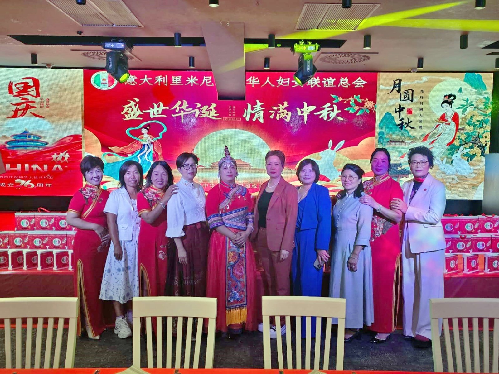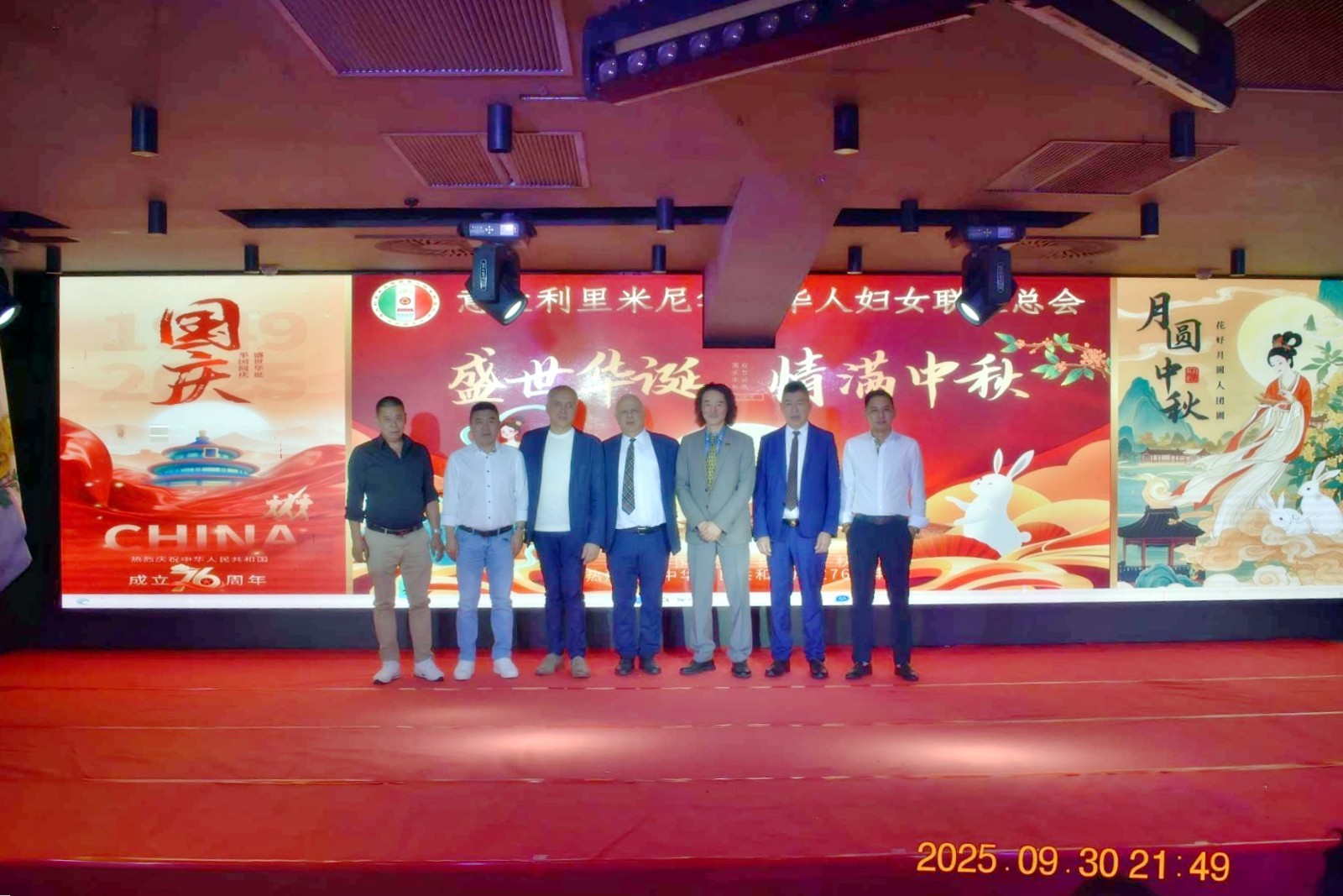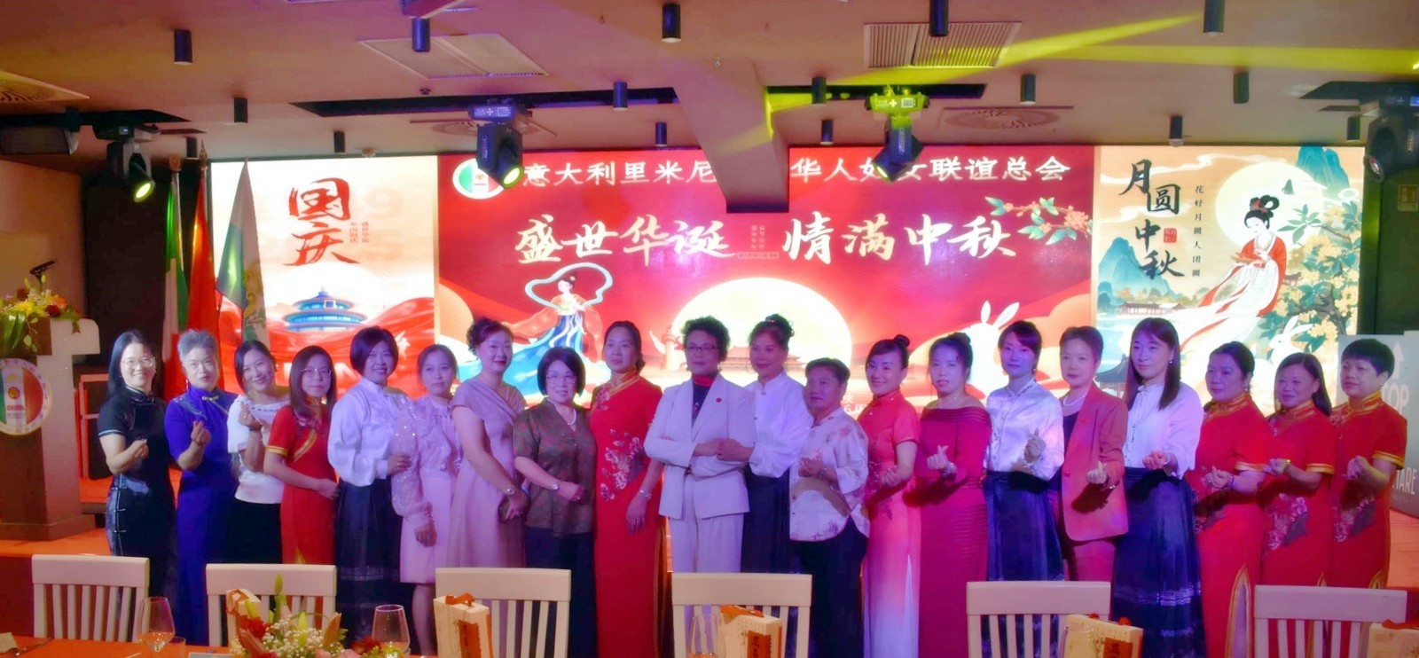 欧洲壹佰君2025年10月1日意大利里米尼电:9月30日晚,意大利里米尼华侨华人妇女联谊总会在里米尼市海滨酒店宴会厅隆重举办“庆国庆·迎中秋”主题晚会。来自圣马力诺共和国、意大利地方政要、侨界社团代表、留学生代表及中意友好人士等两百余位嘉宾齐聚一堂,在喜庆祥和的氛围中,共同庆祝中华人民共和国成立76周年华诞,并欢度中华民族的传统佳节——中秋节。