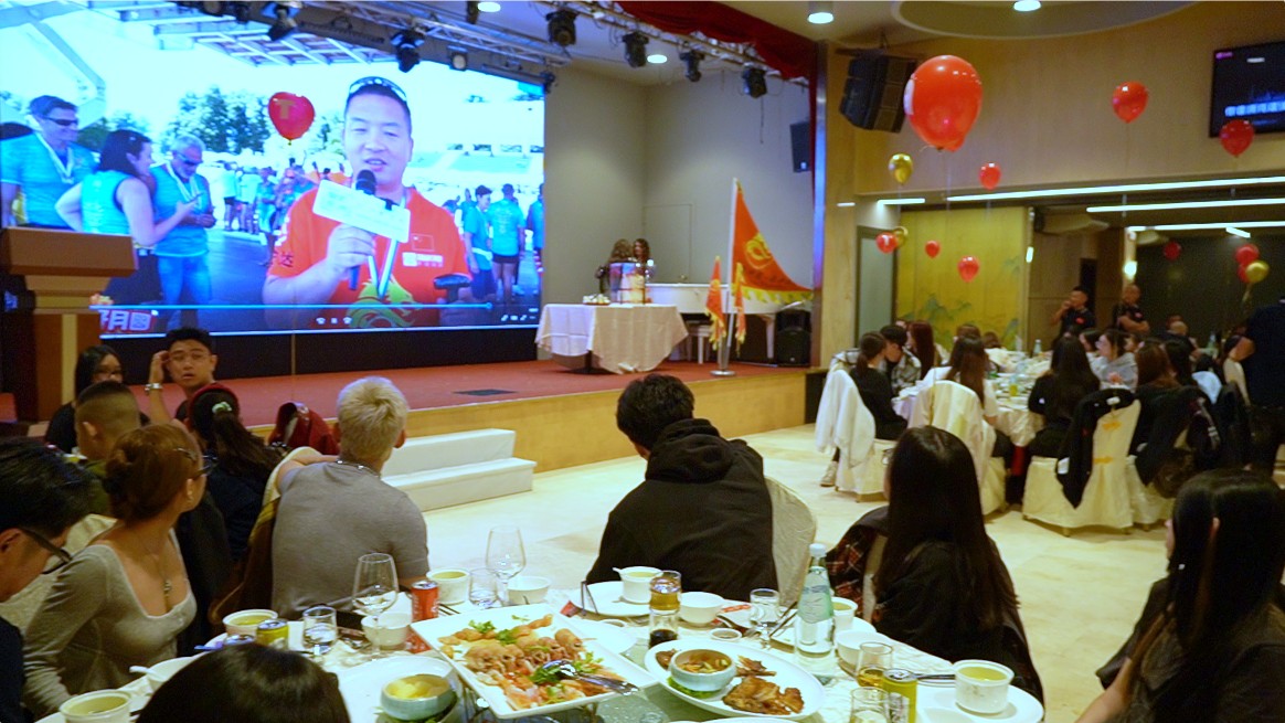 随着灯光渐暗,大屏幕上播放起中龙龙舟队近年来的训练与比赛视频。画面中,队员们挥桨击水、口号嘹亮,在湖上奋力前行的场景令人热血沸腾。那一滴滴汗水、一次次冲刺,凝结着无数日夜的努力与坚持。