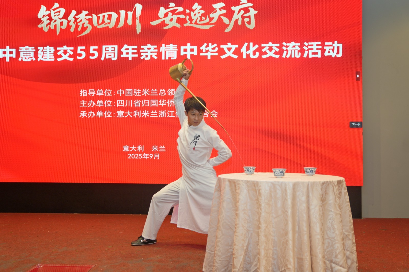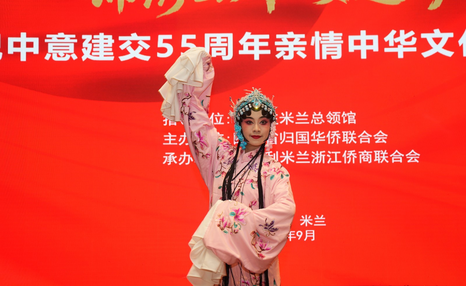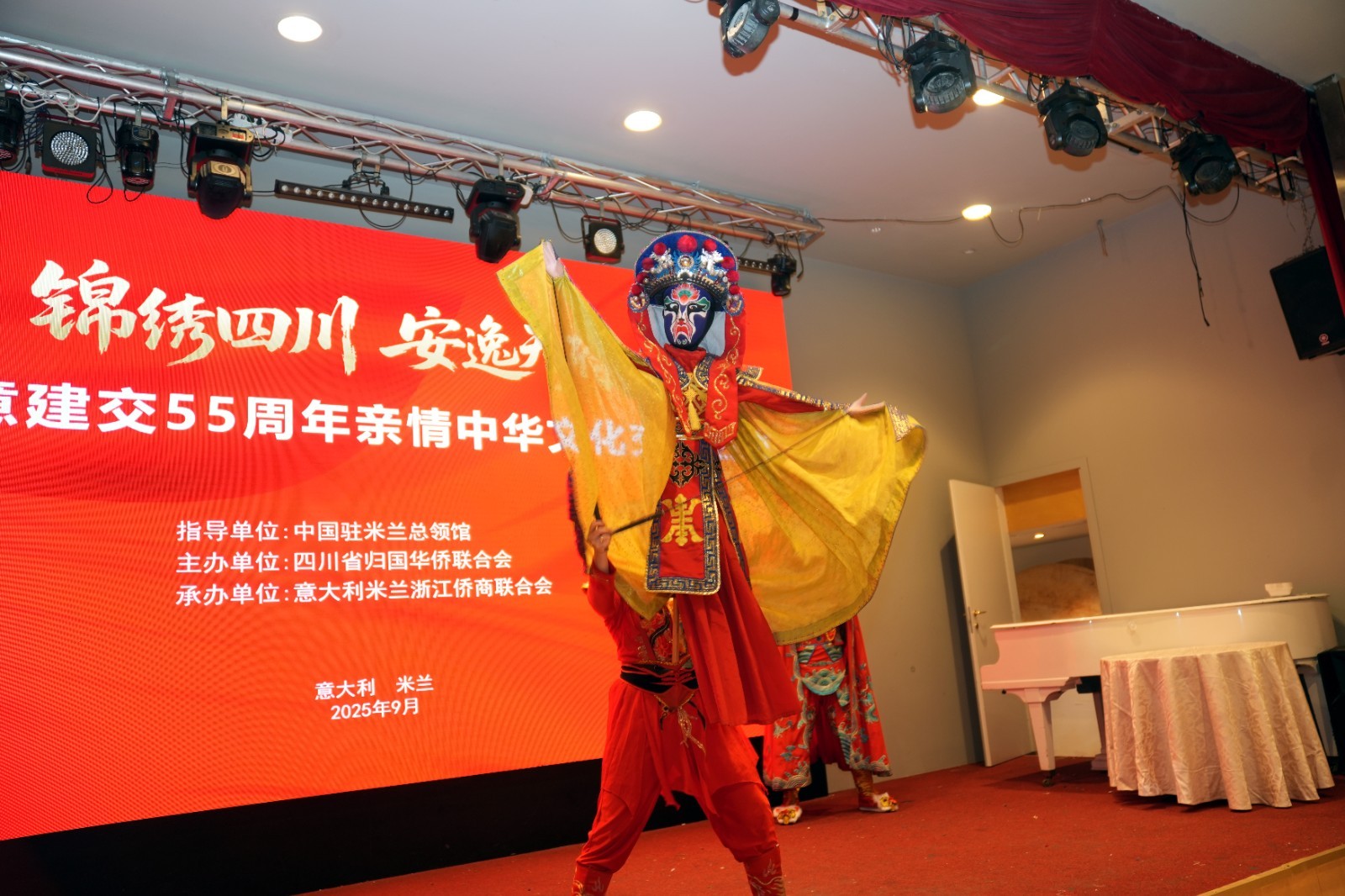 欧洲壹佰君2025年9月19日意大利米兰电:9月18日,由四川省侨联专职副主席黄灏率领的四川省侨务代表团莅临意大利米兰考察访问,受到米兰侨界多个侨团的热烈欢迎。在中国驻米兰总领事馆指导下,由四川省归国华侨联合会主办,米兰浙江侨商联合会承办的“庆祝中意建交55周年暨亲情中华文化交流活动”在米兰君悦大酒店隆重举行。来自中意两国的政要、侨领、文化界人士以及华侨华人代表齐聚一堂,共襄盛举。