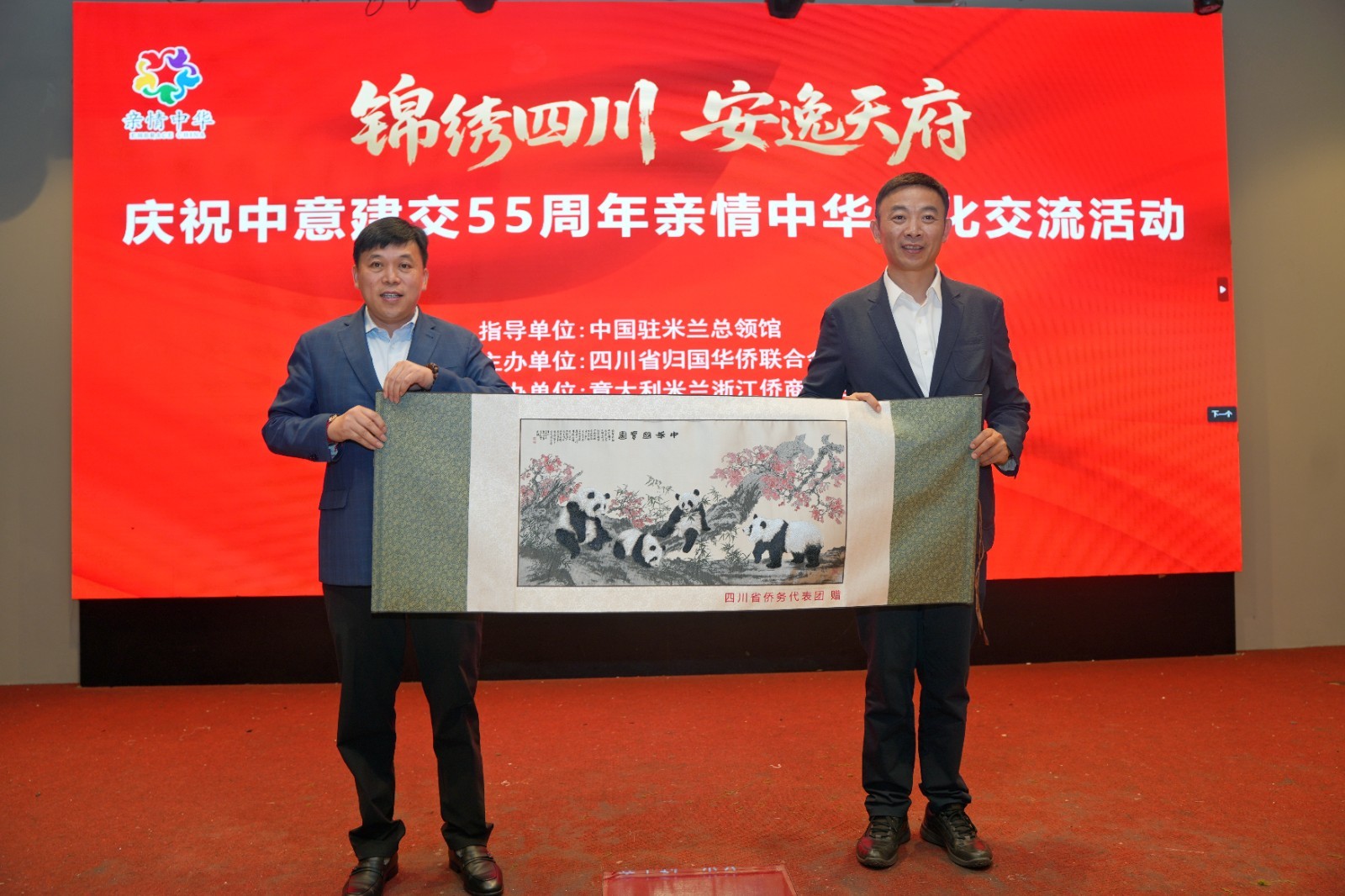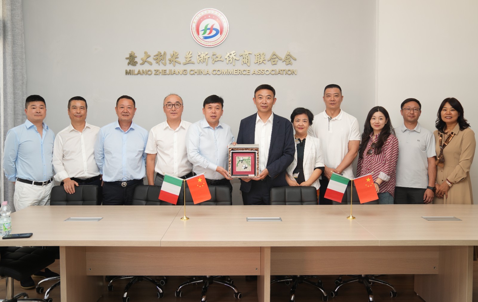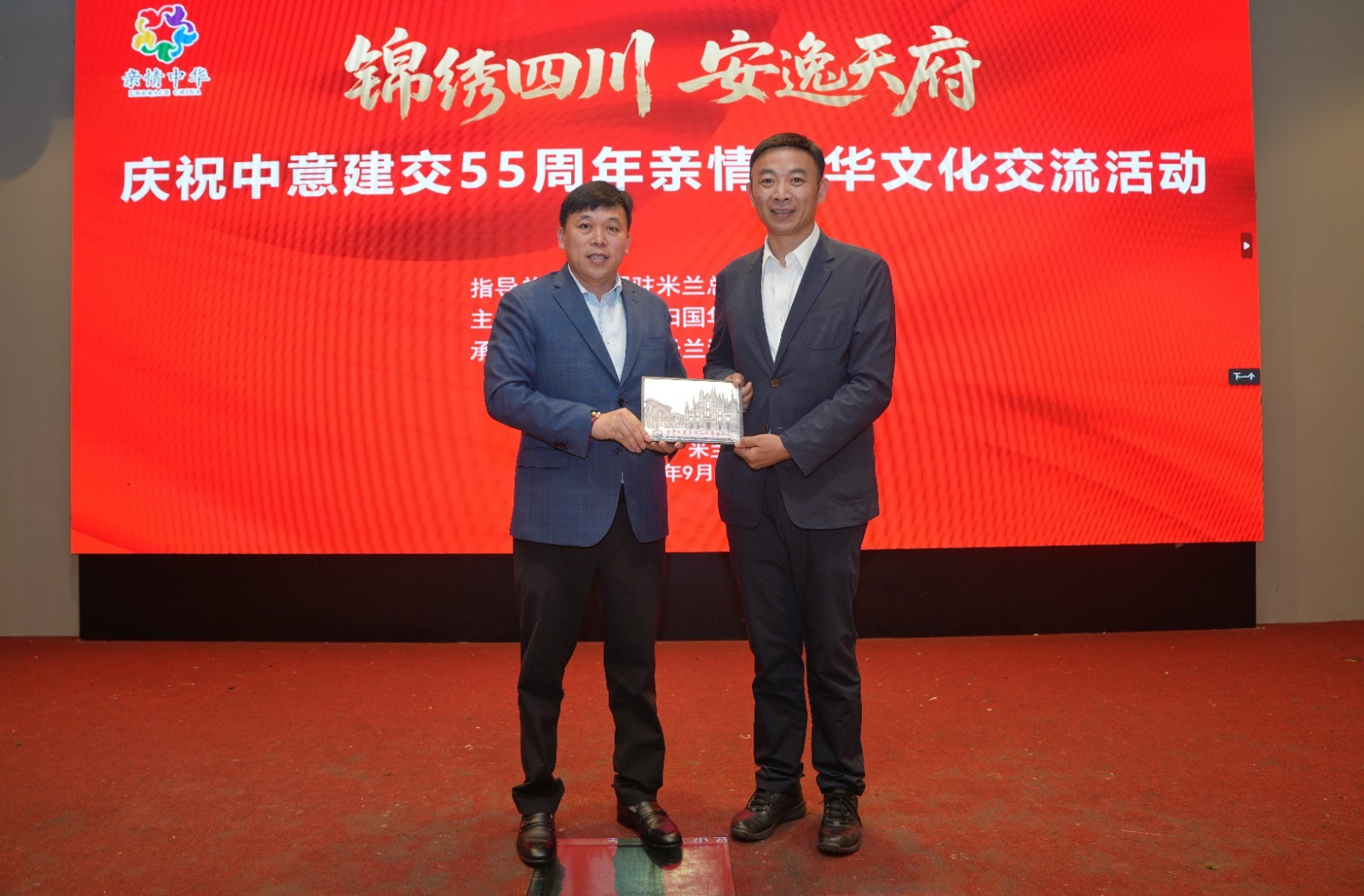 (四川省侨联代表团与米兰浙江侨商联合会交换纪念品)
