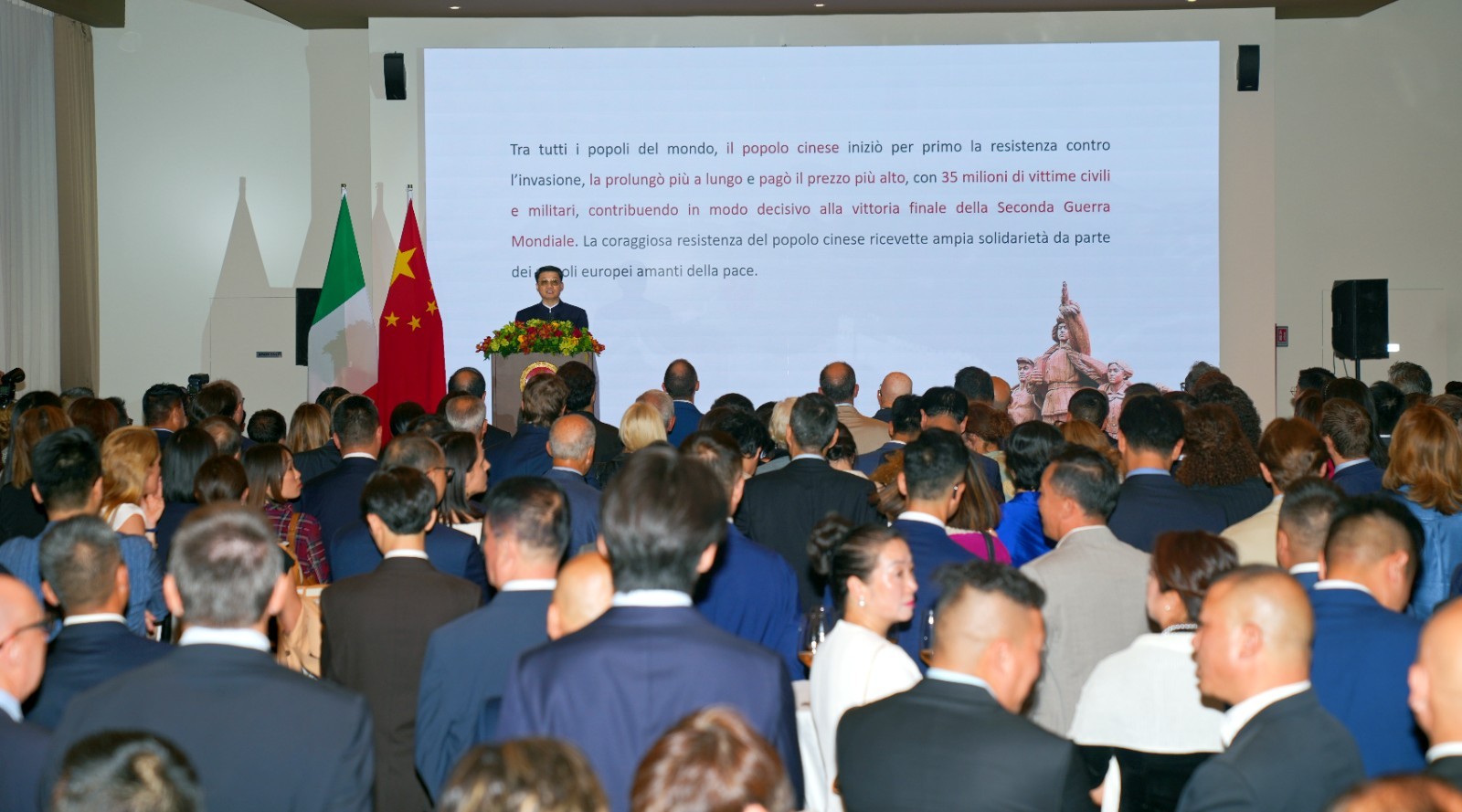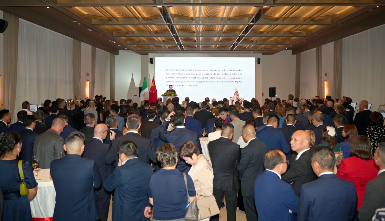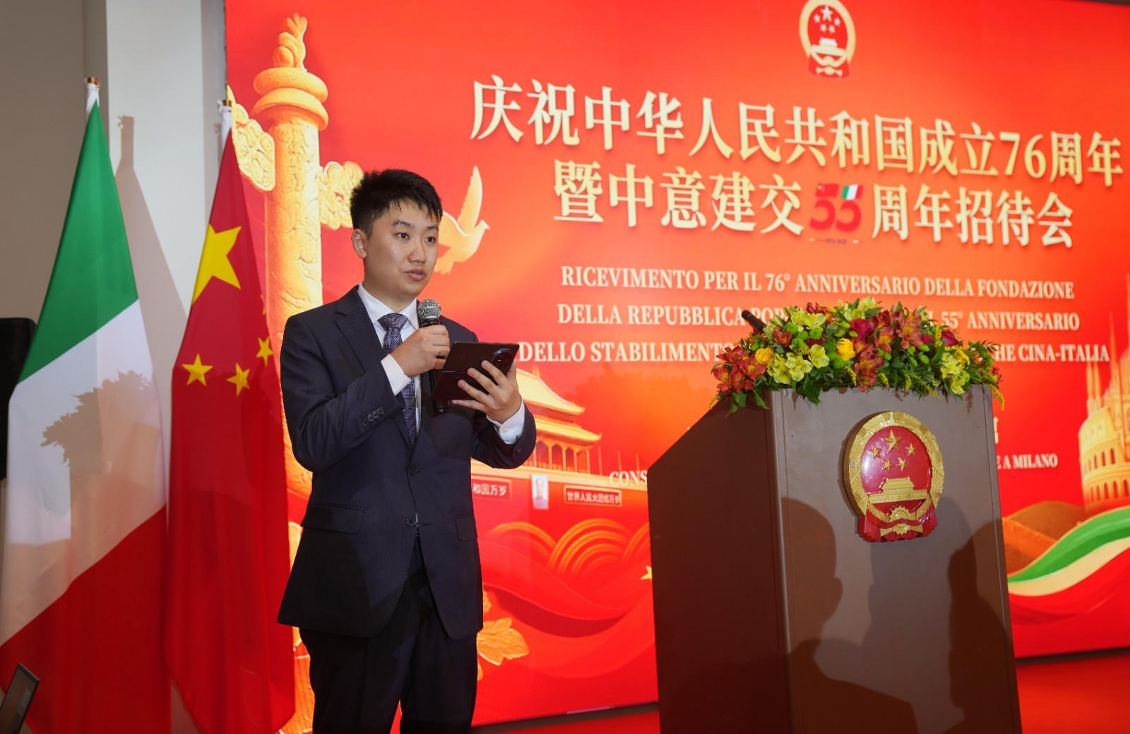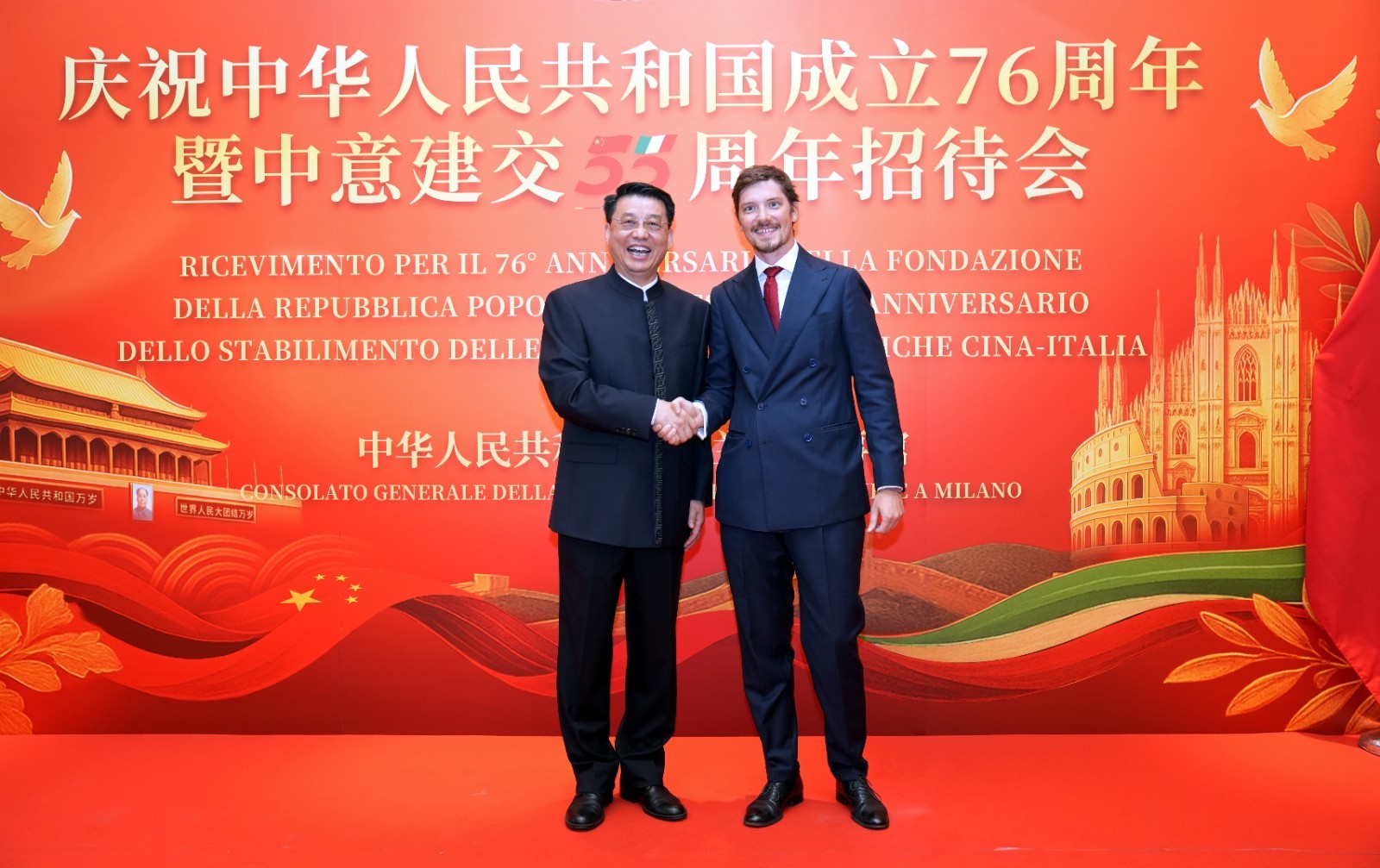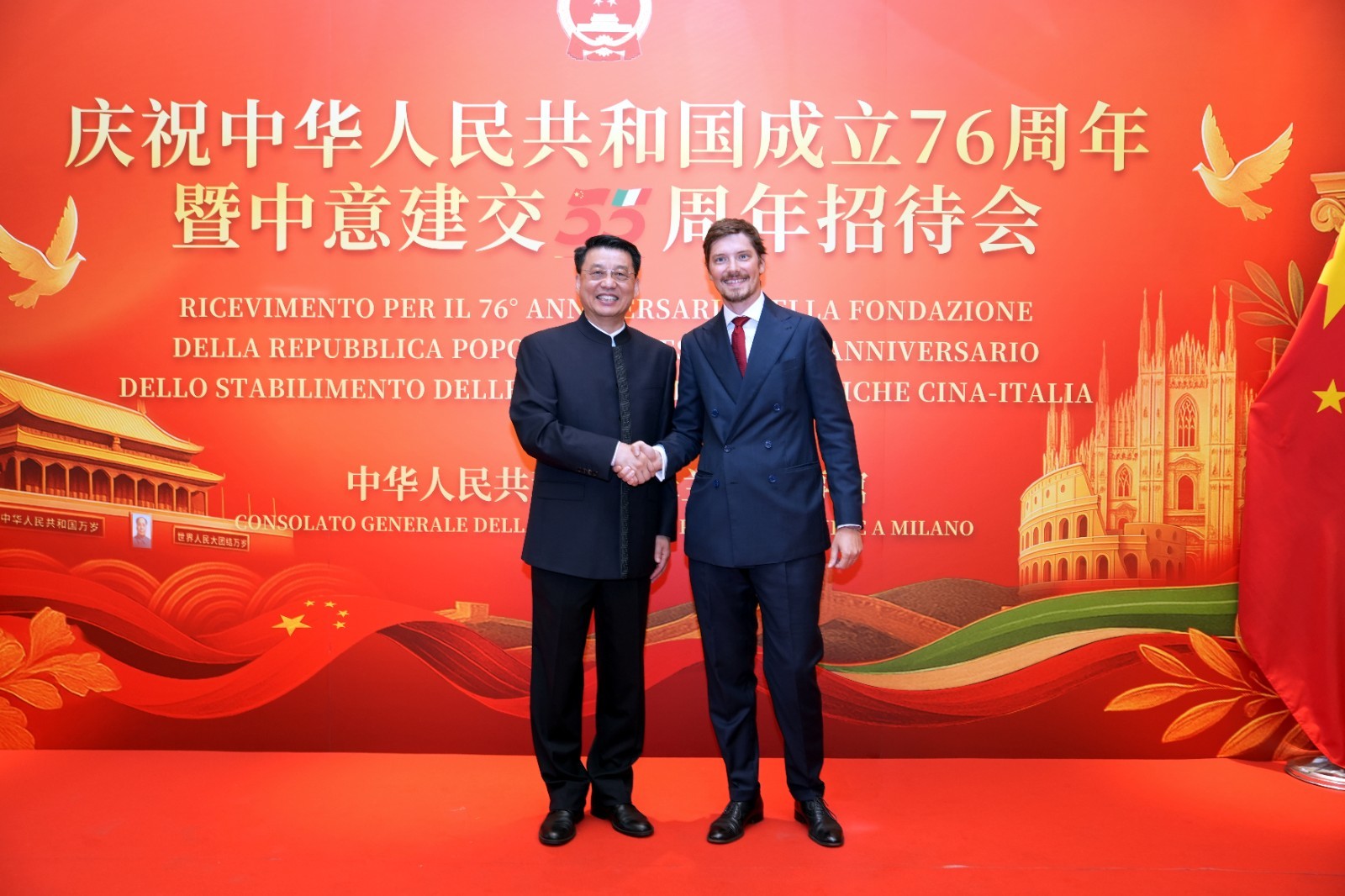 中国驻米兰总领事刘侃回顾新中国成立76年来取得的经济快速发展和社会长期稳定历史性成就,及中意各领域交往合作丰硕成果,强调中国坚持改革开放和创新驱动,以新质生产力推动高质量发展,为世界经济注入动力与稳定。希望中意以建交55周年为契机,共同推动两国全面战略伙伴关系迈上新台阶。同时强调,今年也是中国人民抗日战争暨世界反法西斯战争胜利和联合国成立80周年,中国愿与各方一道高举和平发展旗帜,落实习近平主席新近提出的全球治理倡议,推动构建更加公正合理的全球治理体系,携手迈向人类命运共同体。